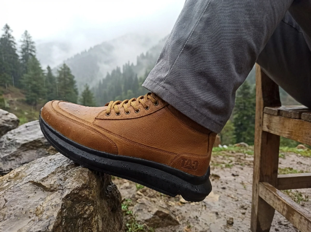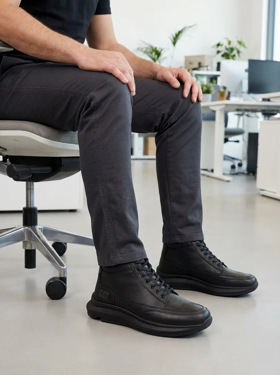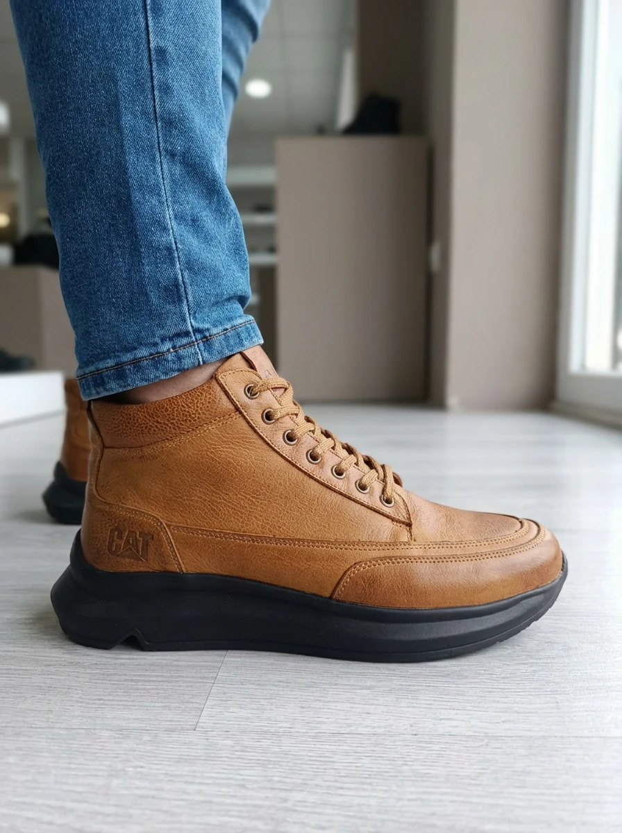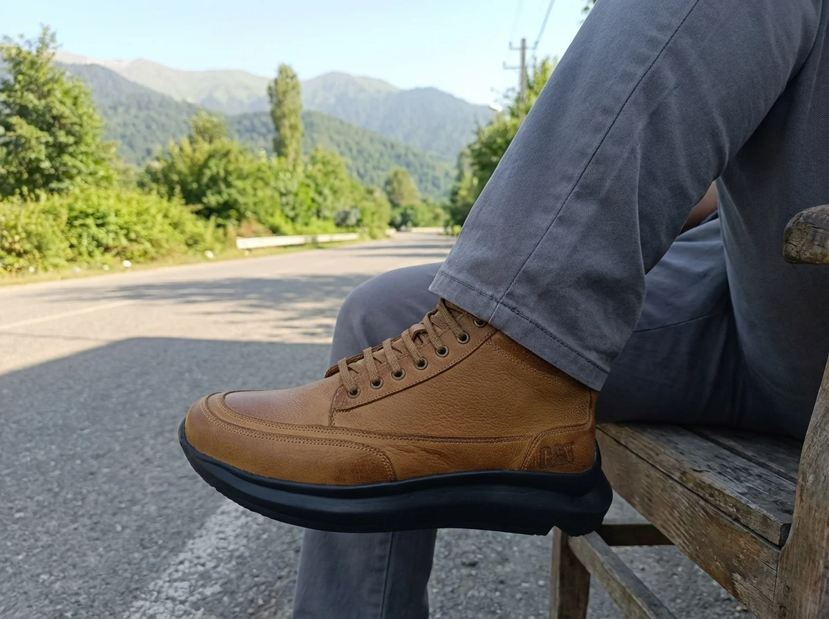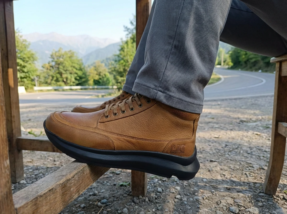 چرم گاوی ضخیم و باکیفیت، کفی مقاوم با چسبندگی بالا، دوخت تمیز، و لوگوی CAT با رنگ استاندارد خودش—همهچیزش داد میزنه حرفهای و قابل اعتماد.